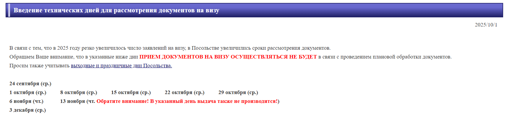 The Japanese Embassy in Moscow has suspended accepting applications on Wednesdays in October and November. The following dates are affected by the restrictions: